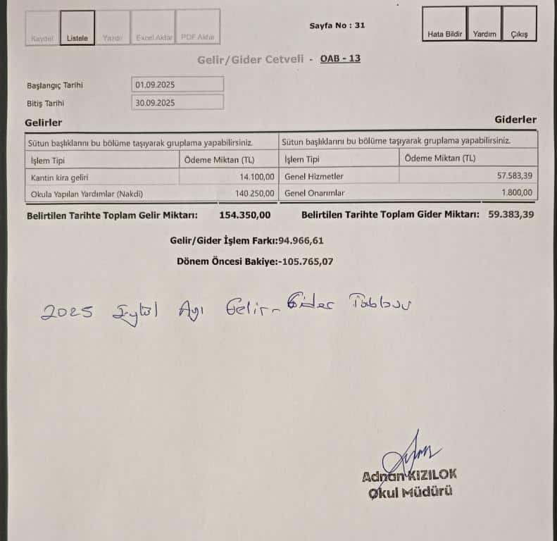 2025 Eylül Ayı Gelir-Gider Tablosu